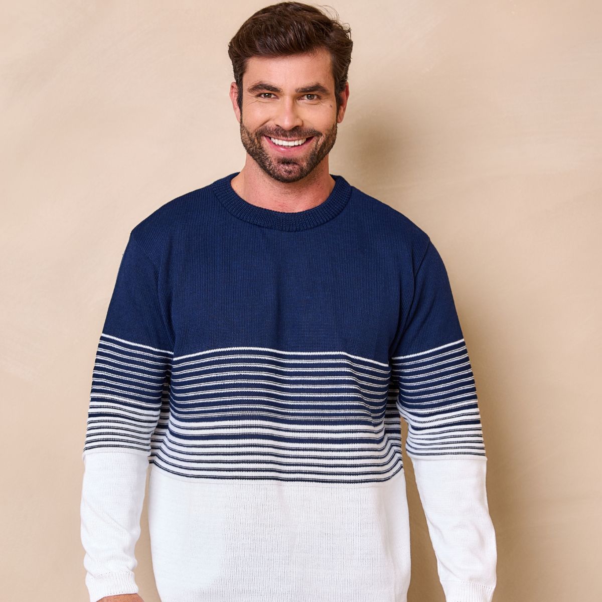 Aposte no estilo e conforto com este suéter masculino tricolor em tricô. Com design moderno, a peça apresenta a parte superior em azul marinho, faixa central com listras horizontais. Ideal para dias amenos, o suéter combina facilmente com calças jeans ou de sarja para compor looks casuais e elegantes.