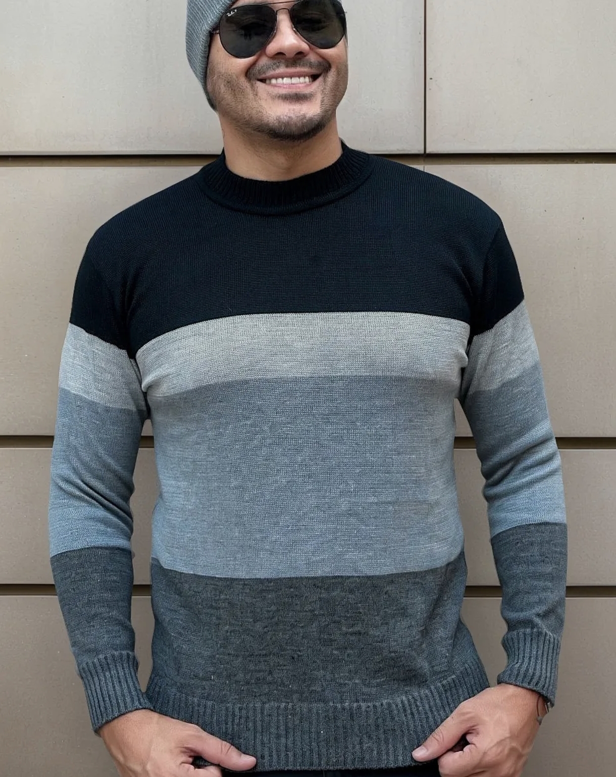 Moderno e versátil, este suéter masculino em tricô é perfeito para compor looks estilosos nos dias mais frios. A peça apresenta listras horizontais em diferentes tons de cinza e preto, criando um visual sofisticado e fácil de combinar. Com gola careca, punhos e barra canelados, o suéter oferece conforto e ótimo caimento ao corpo.