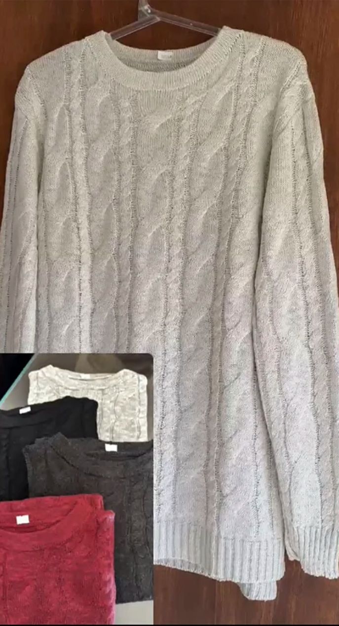 Suéter feminino em tricô na cor cinza, com padronagem de tranças ao longo da peça. Tem gola redonda e modelagem tradicional, ideal para dias mais frios, combinando conforto com um estilo clássico.