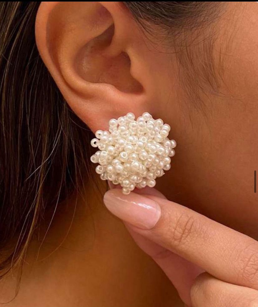 Brinco em formato de flor, composto por pérolas pequenas agrupadas, formando uma peça marcante e elegante. Ótimo para ocasiões especiais ou para adicionar sofisticação ao look do dia a dia.